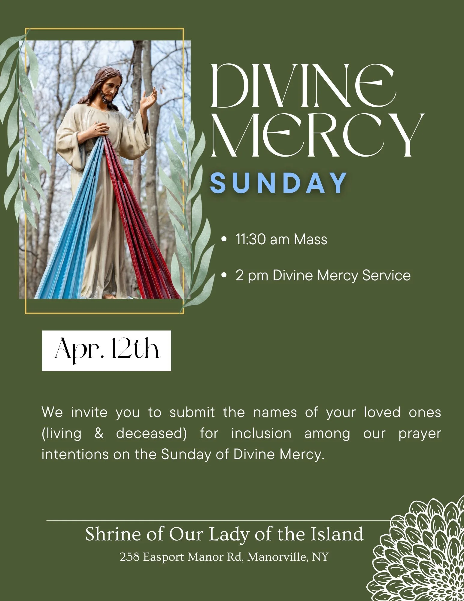 We invite you to submit the names of your loved ones (living and deceased) for inclusion among our prayer intentions on the Sunday of Divine Mercy.
