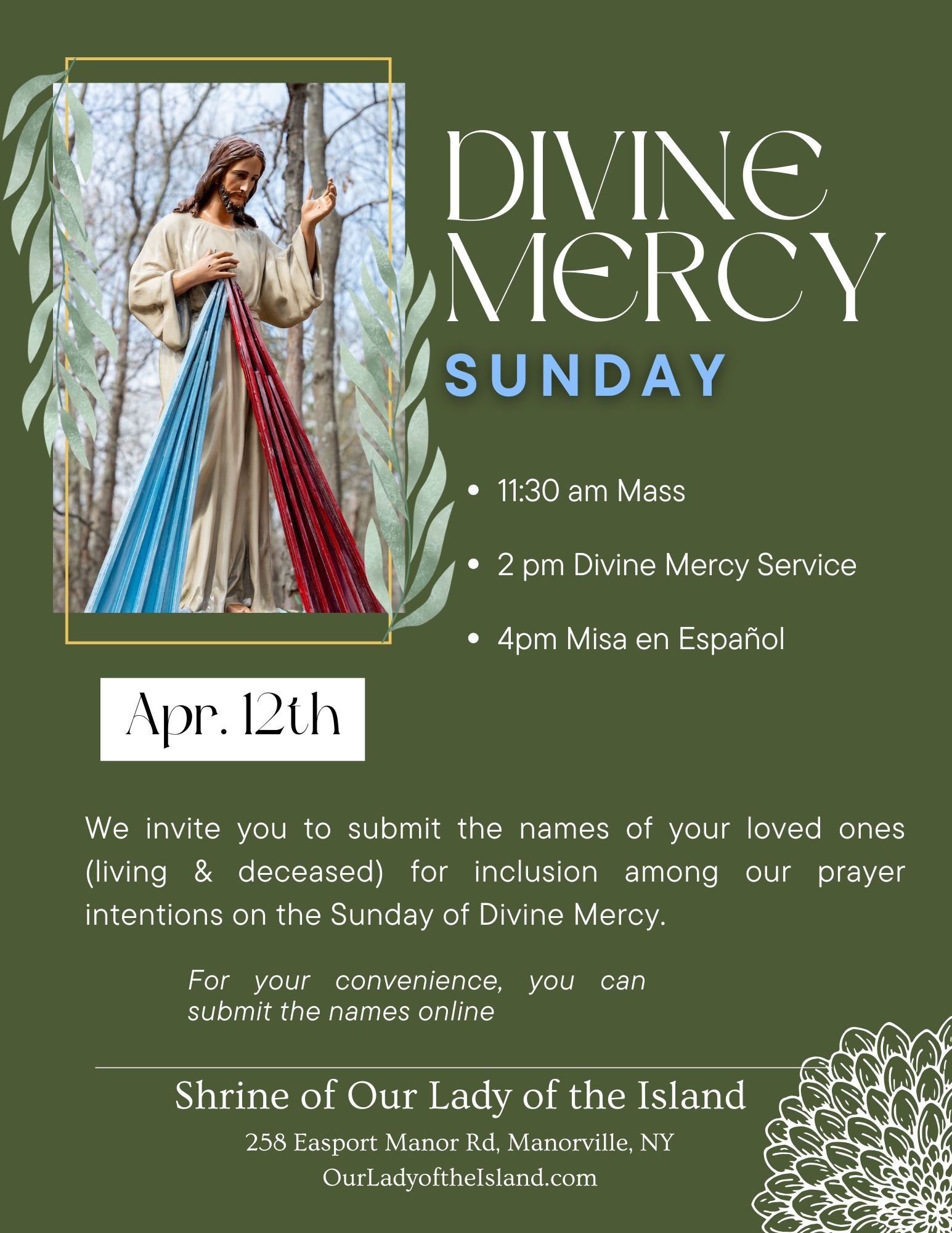 Back to All Events Divine Mercy Sunday Sunday, April 12, 2026 11:30 AM 2:00 PM Shrine of Our Lady of the Island (map) Google Calendar ICS Offering…