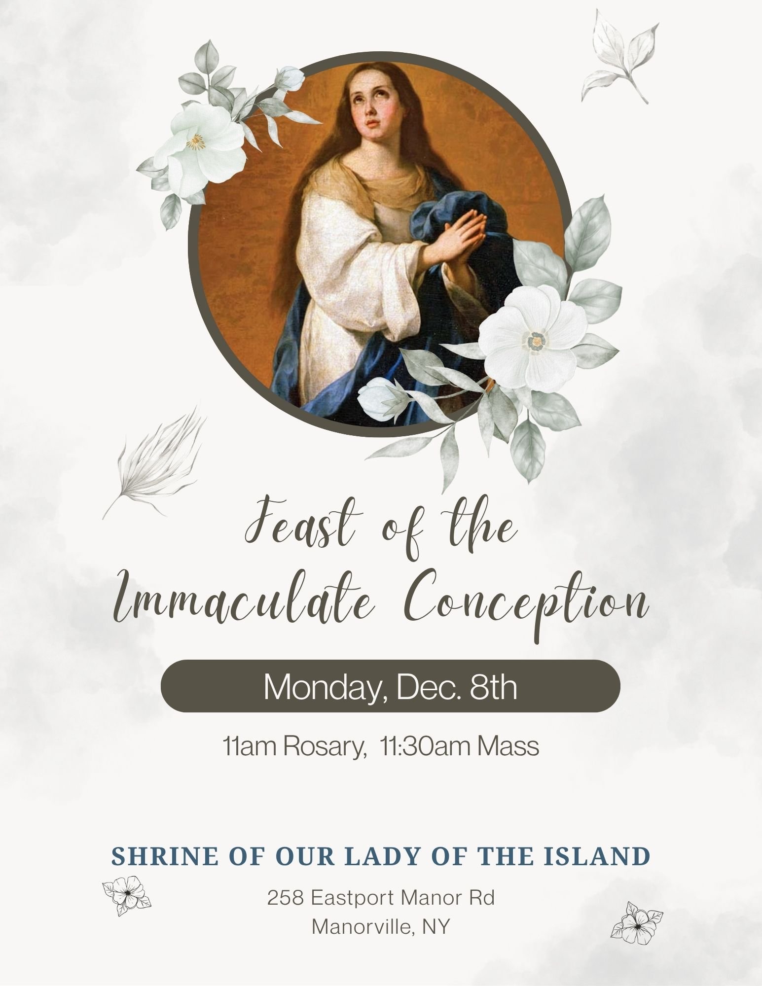 Feast of the Immaculate Conception Monday, December 8, 2025 11:00 AM 12:30 PM Shrine of Our Lady of the Island (map) Google Calendar ICS