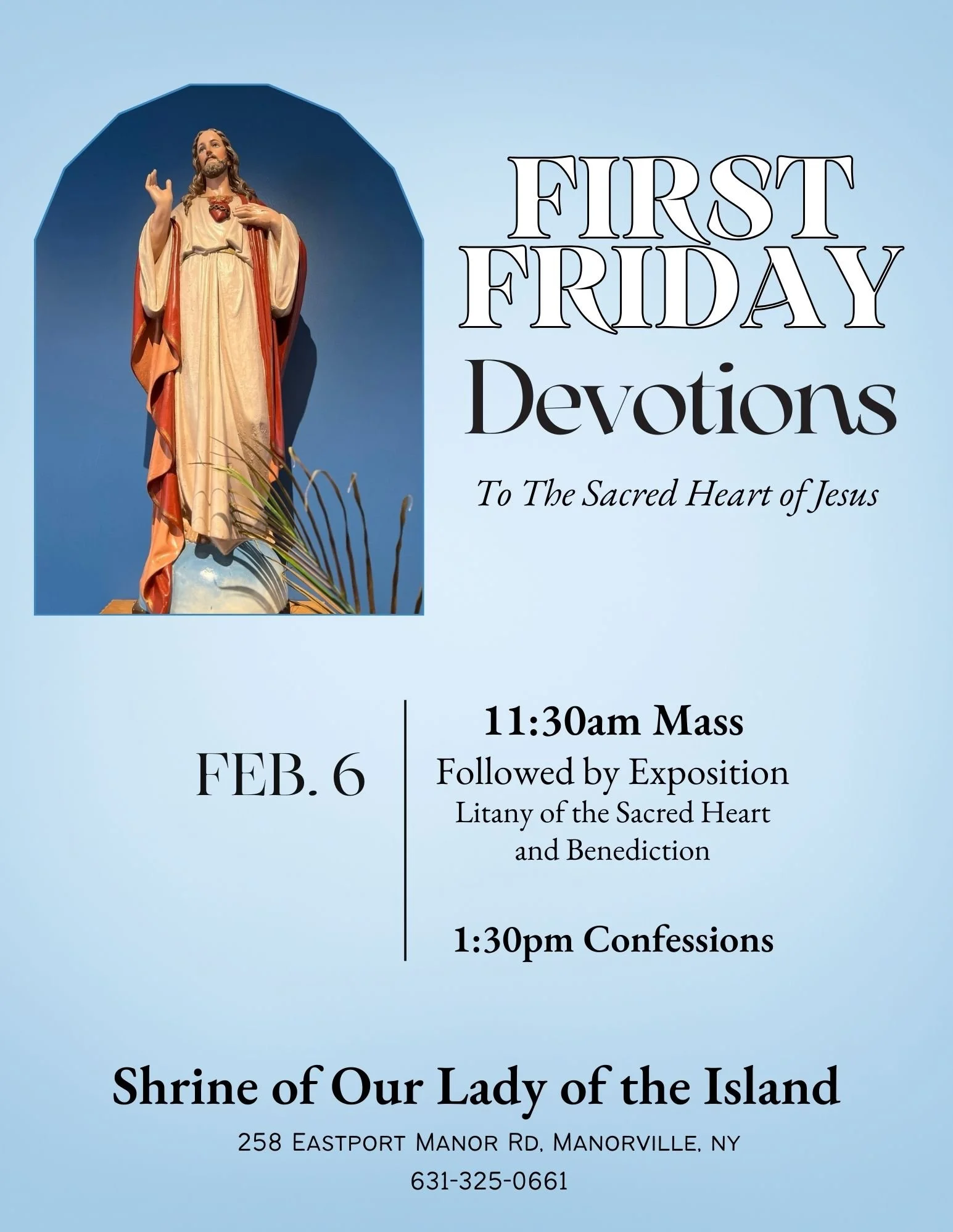 First Friday Devotions Friday, February 6, 2026 11:30 AM 1:30 PM Shrine of Our Lady of the Island (map) Google Calendar ICS