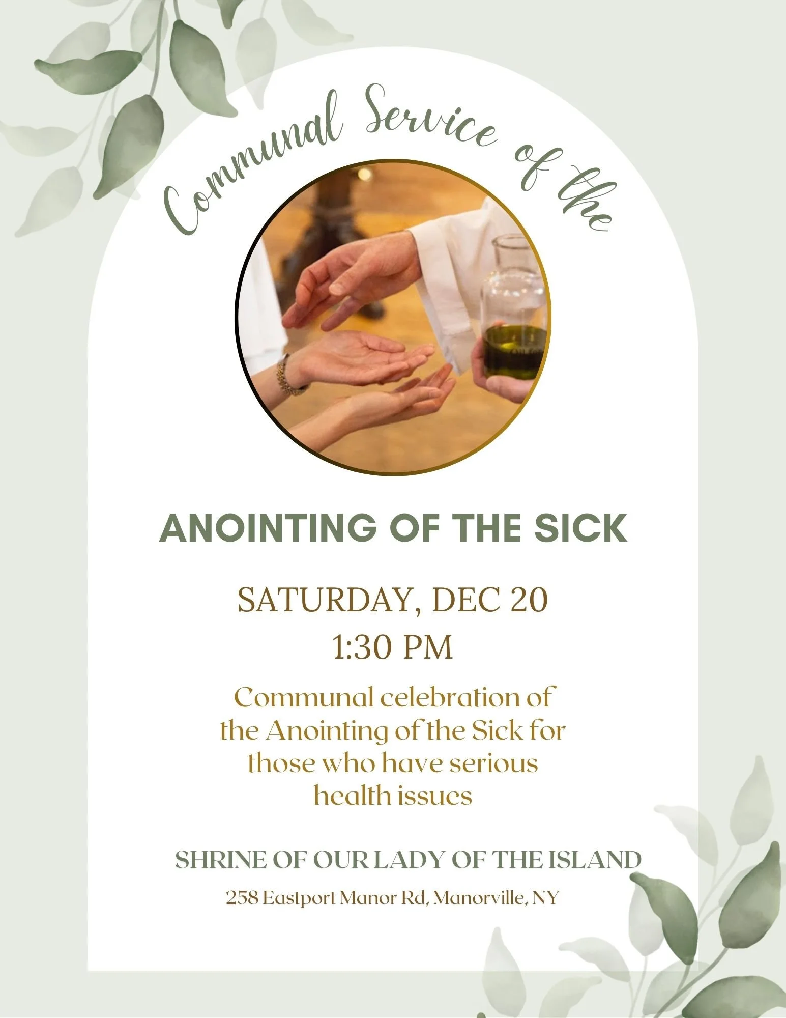 Service of the Anointing of the Sick Saturday, December 20, 2025 1:30 PM 2:30 PM Shrine of Our Lady of the Island (map) Google Calendar ICS